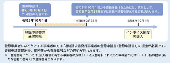 登録申請書は、令和3年10月1日より提出が可能です。また、令和5年10月1日より登録を受ける場合、原則、令和5年3月31日までに登録申請書を提出する必要があります。
