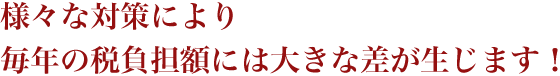 不動産オーナーの方の税負担額は、様々な対策により大きな差が生じます。不動産税務に特化したわたしたちが、所得税・法人税・相続税など様々な税金を考慮した対策をご提案いたします。